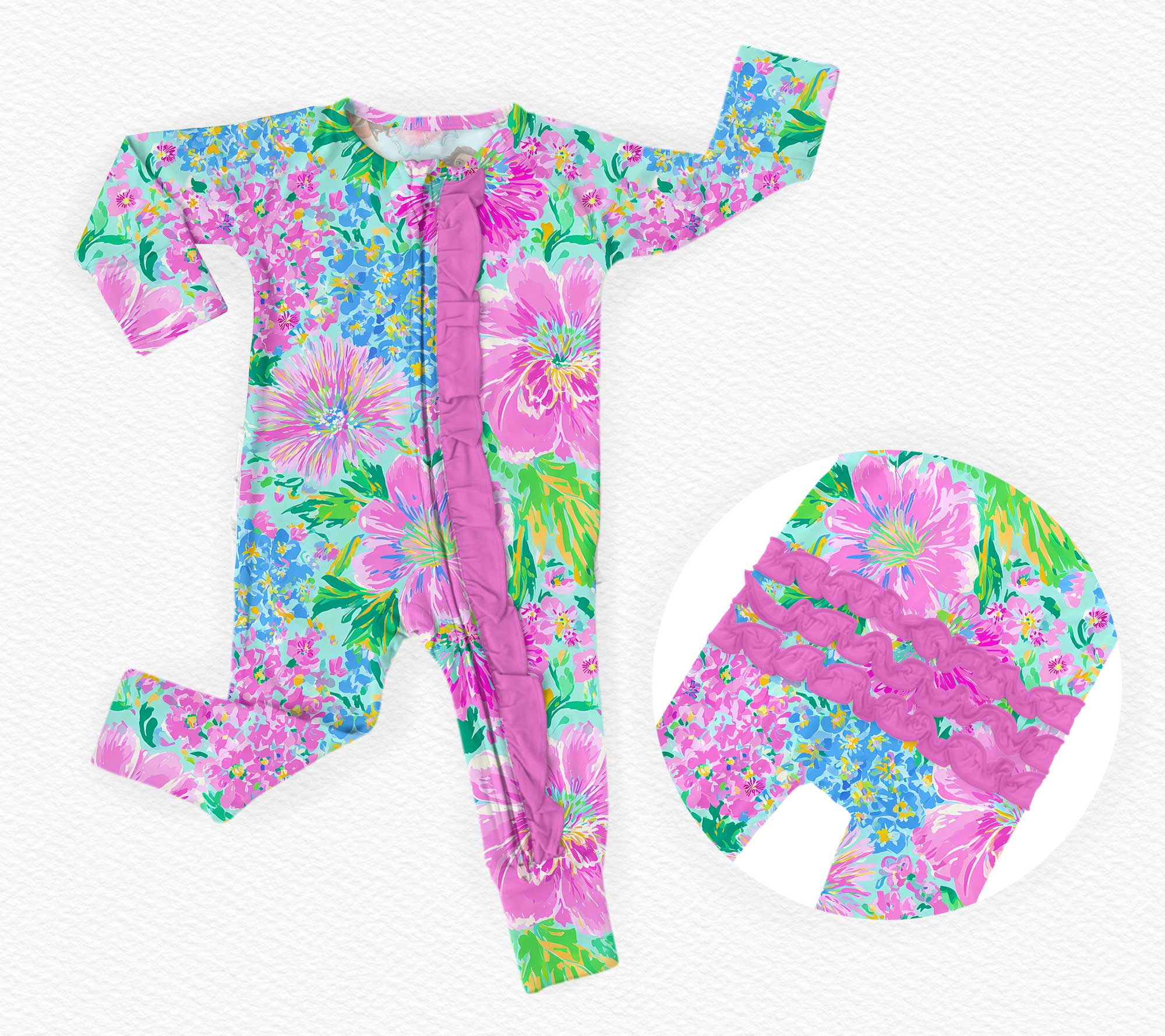 [Pre Order] Summer Vibes Harbor Hydrangea - Bamboo Ruffled Zippy Romper with 3 way zipper (EST SHIP EARLY JUNE)