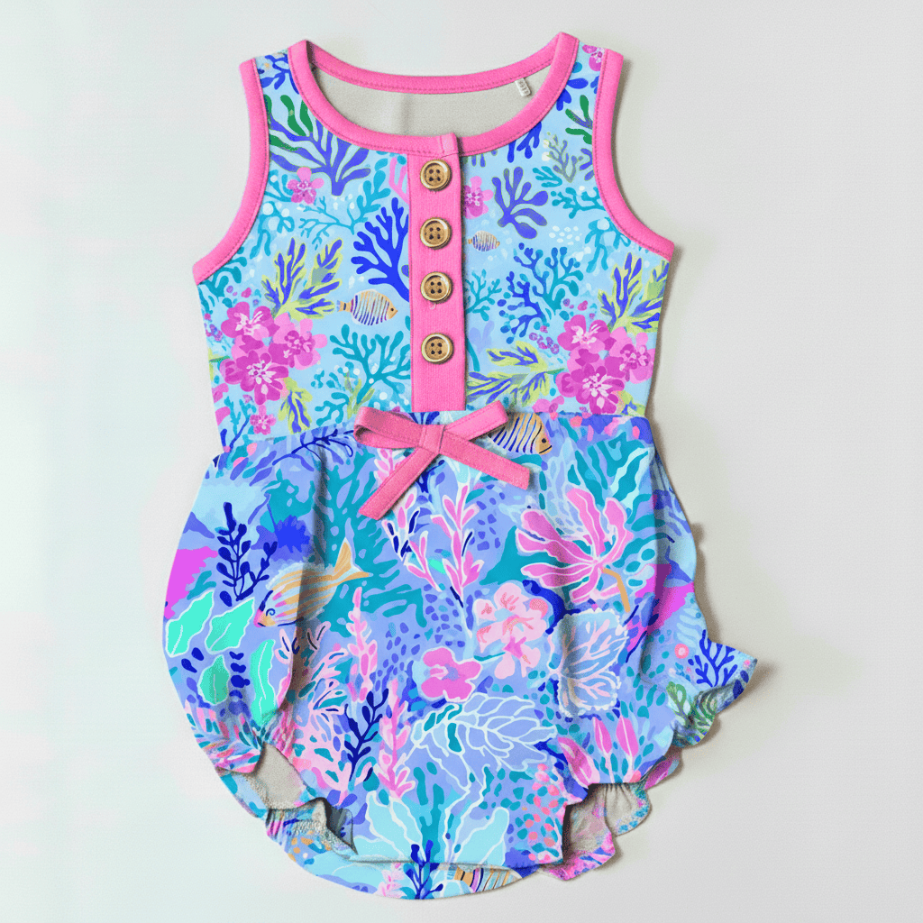 This adorable romper features a charming ruffled bum (up to size 3T), a breezy tank-style top, and a comfy elastic waistband for the perfect fit. Lightweight and breathable, it keeps your little one cool and comfortable all day long.