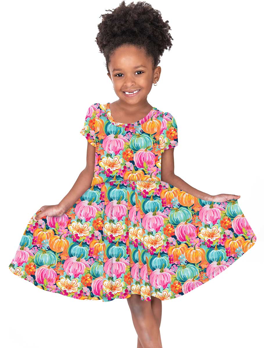 Fallin for Fall Preppy Pumpkins - Girls Short Sleeve Bamboo Twirl Dress