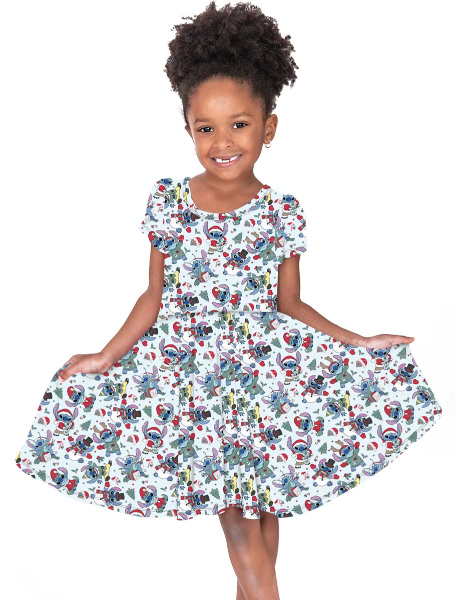 Magical Holidays Festive Stitch - Girls Short Sleeve Bamboo Twirl Dress