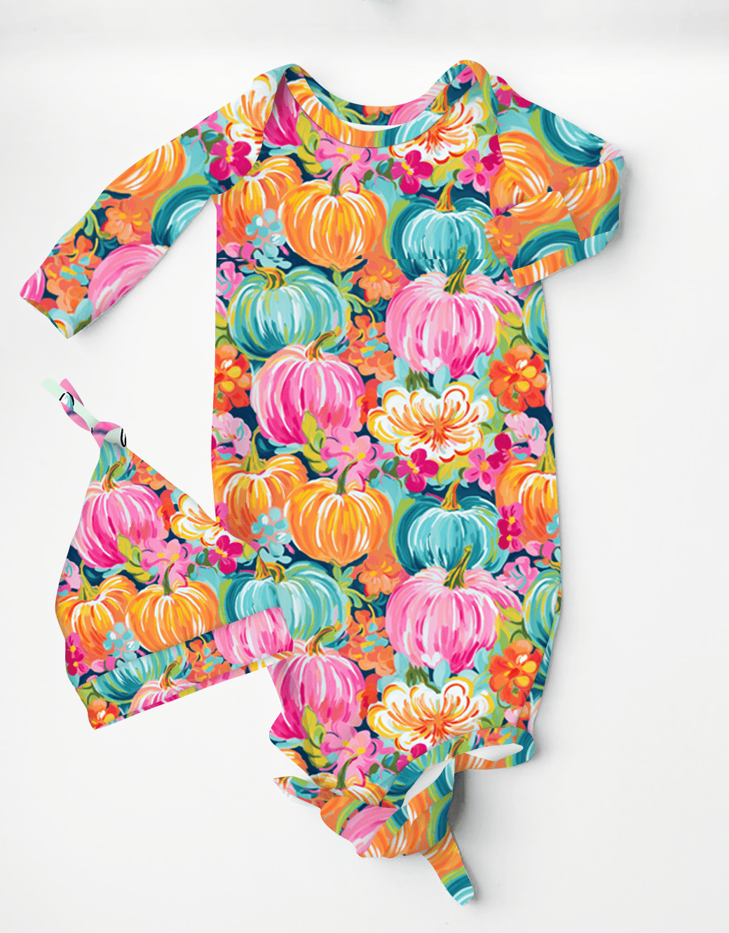 Fallin for Fall Preppy Pumpkins - Bamboo Baby Knotted Gown with Beanie