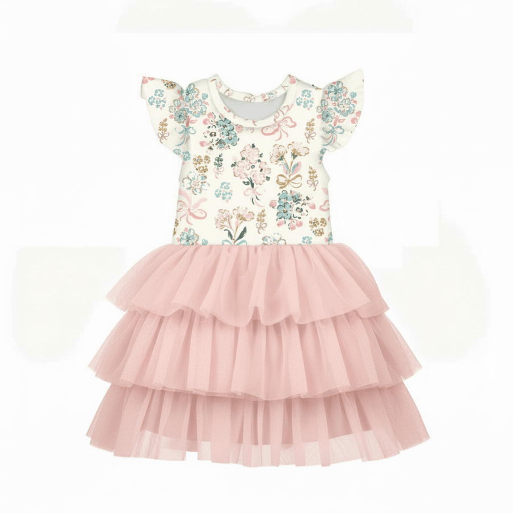 [Pre Order] Springtime Edit Ribbon Meadows - Girls Flutter Sleeve Bamboo Tiered Tulle Dress (EST SHIP MID MARCH)