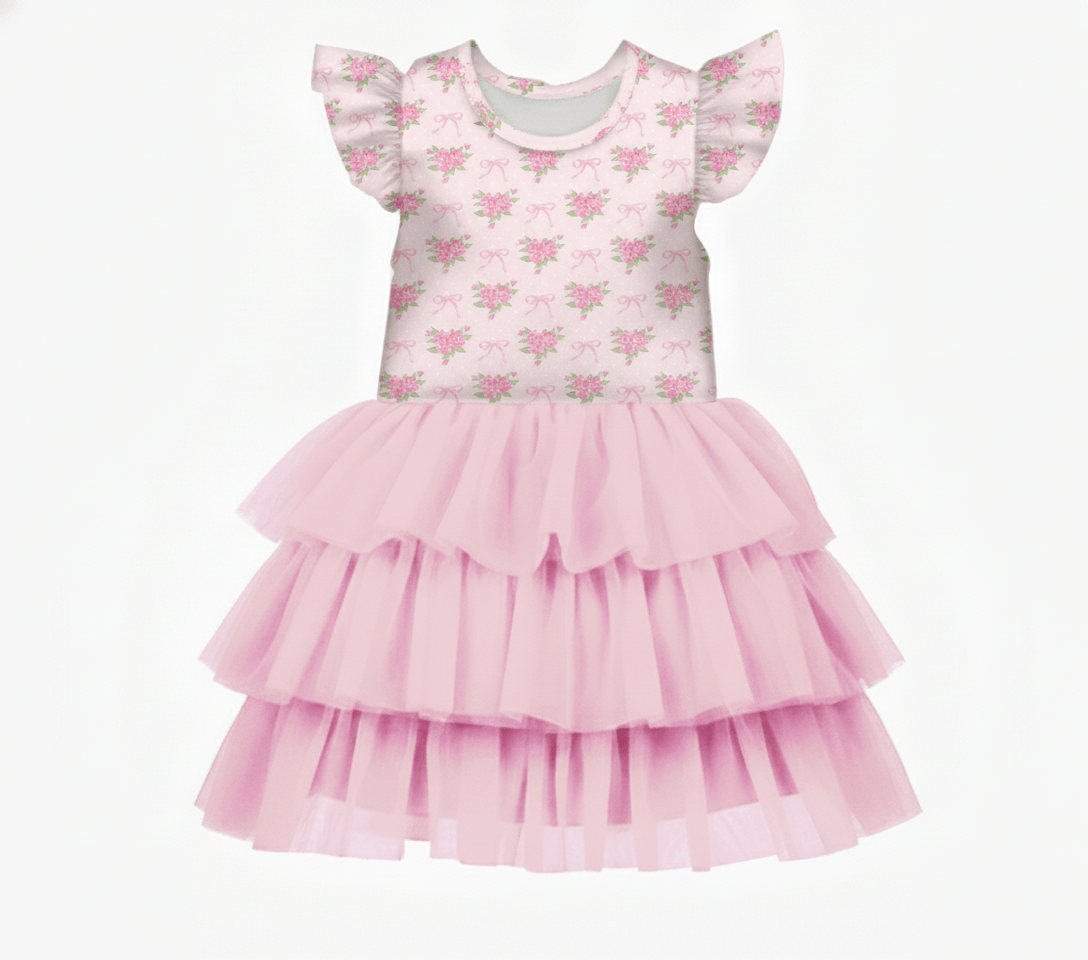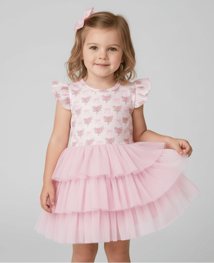 [Pre Order] Springtime Edit Rosewater Ribbons - Girls Flutter Sleeve Bamboo Tiered Tulle Dress (EST SHIP MID MARCH)