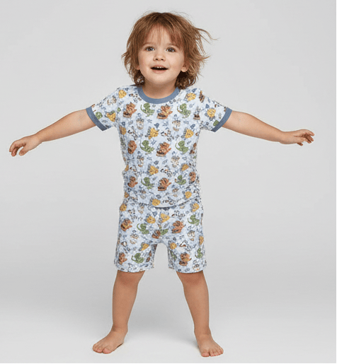 Kids stay super comfortable in this short sleeve and shorts lounge set. Light weight and breathable makes for a good nights sleep!