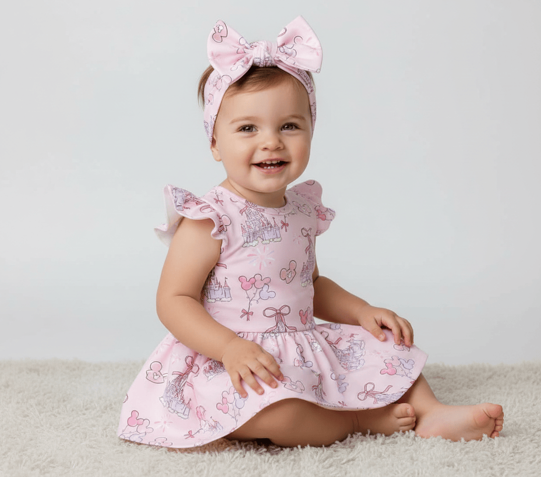Our adorable one piece Twirl Skirt Body Suit with matching Top Knot Head Bow is perfect for any occasion.