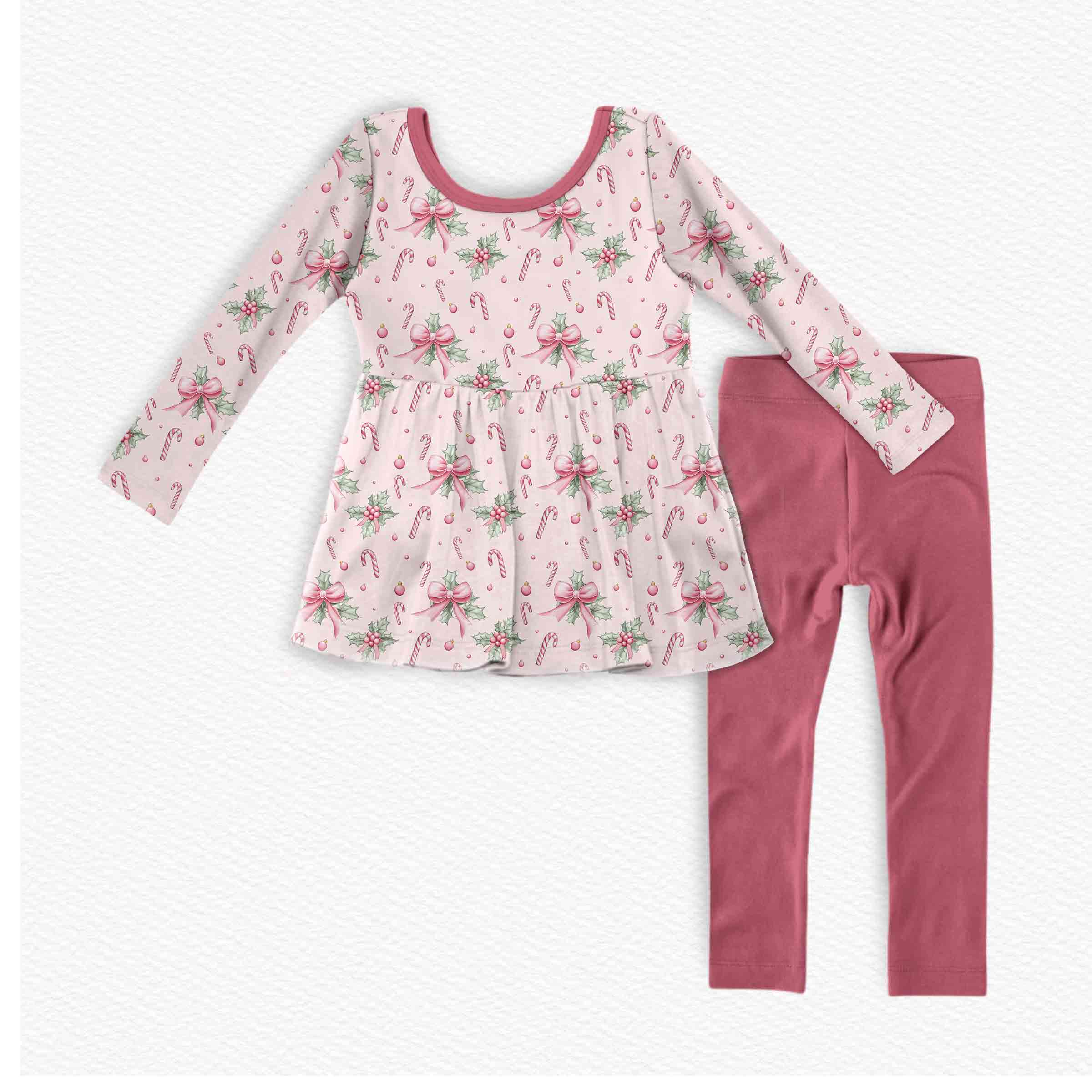 Feelin Festive Peppermint Bows - Bamboo Long Sleeve & Pants Peplum Set