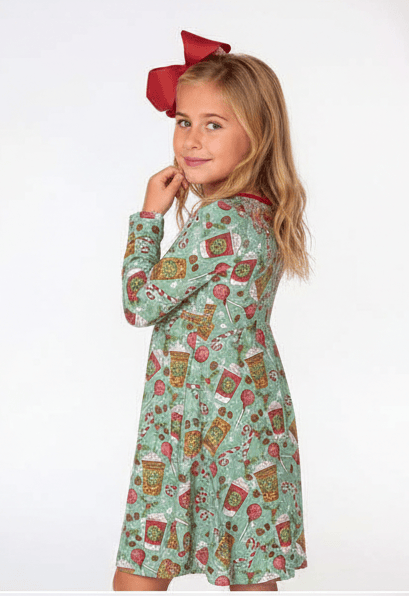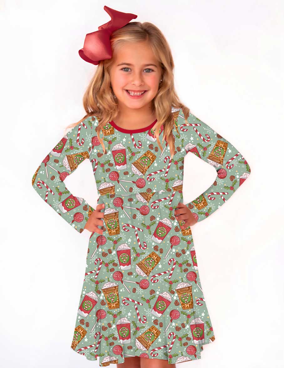 Happy Holidays Mocha Mistletoe - Girls Long Sleeve Bamboo Twirl Dress