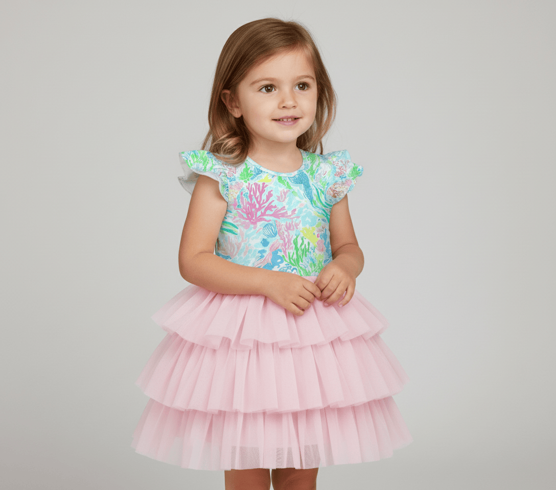 [Pre Order] Dream Big Tropical Tides - Girls Flutter Sleeve Bamboo Tiered Tulle Dress (EST SHIP LATE MARCH)