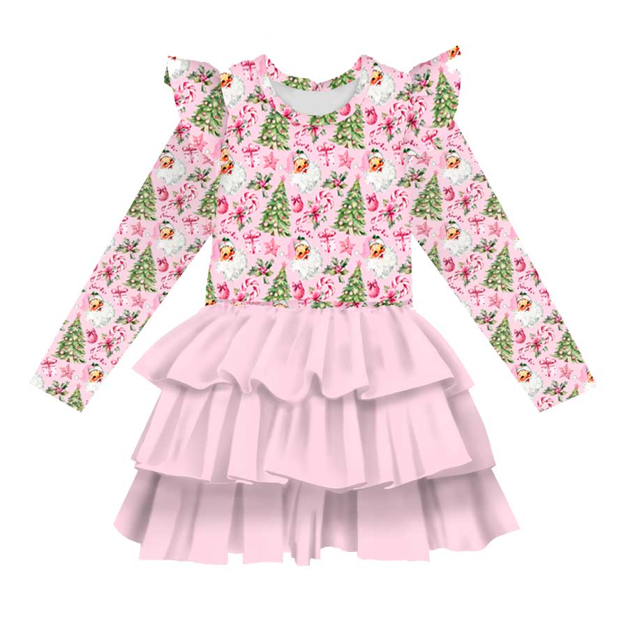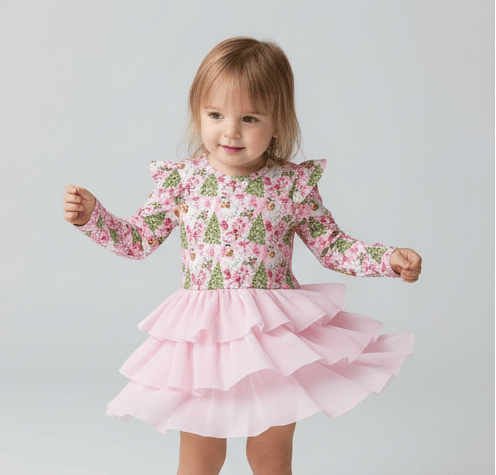 Happy Holidays Pink Noel - Girls Long Sleeve Bamboo Tiered Tulle Dress