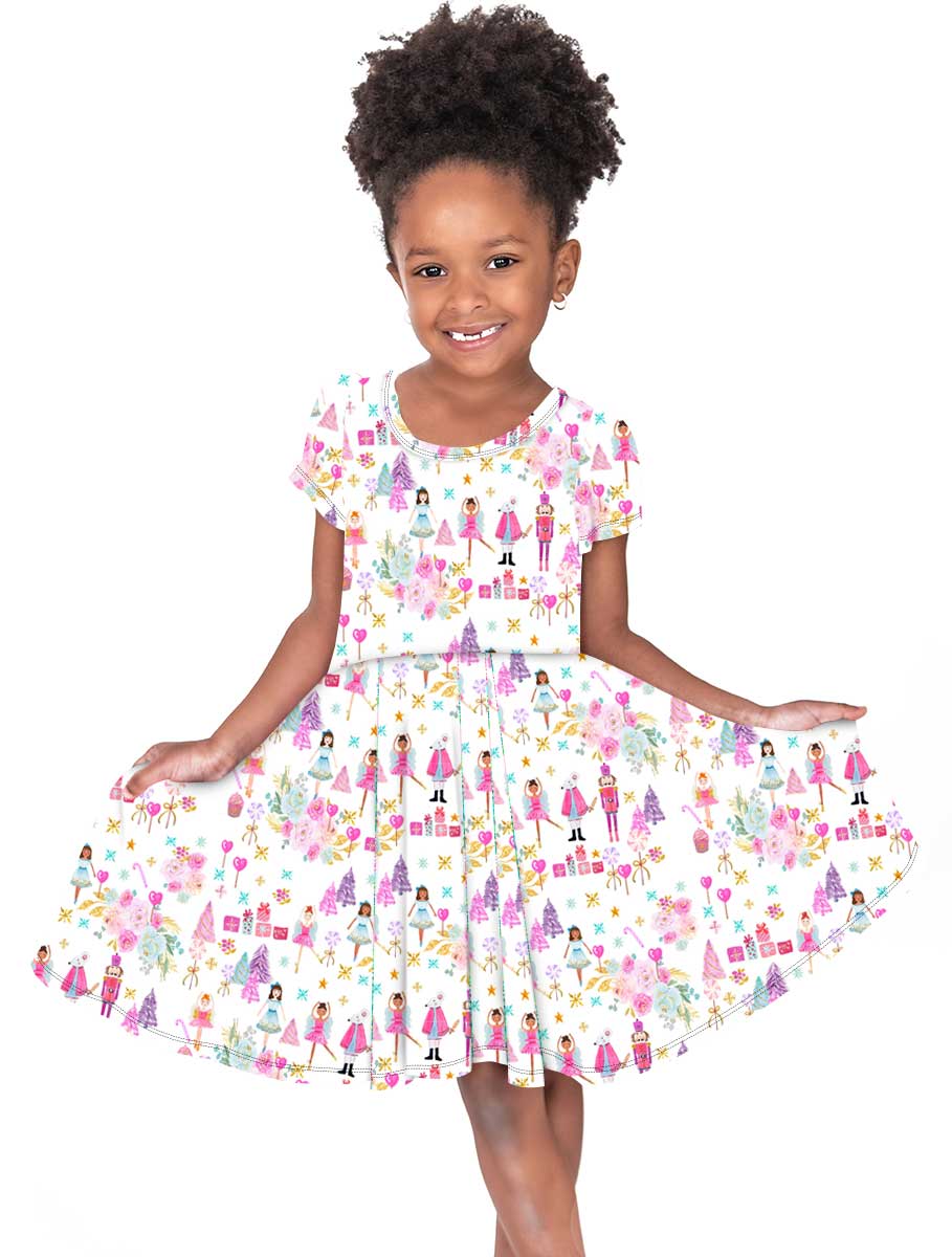Happy Holidays Sugar Plum Fairy - Girls Short Sleeve Bamboo Twirl Dress