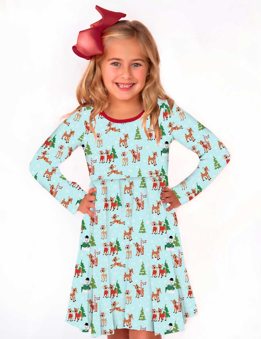 Happy Holidays Reindeer Kisses - Girls Long Sleeve Bamboo Twirl Dress