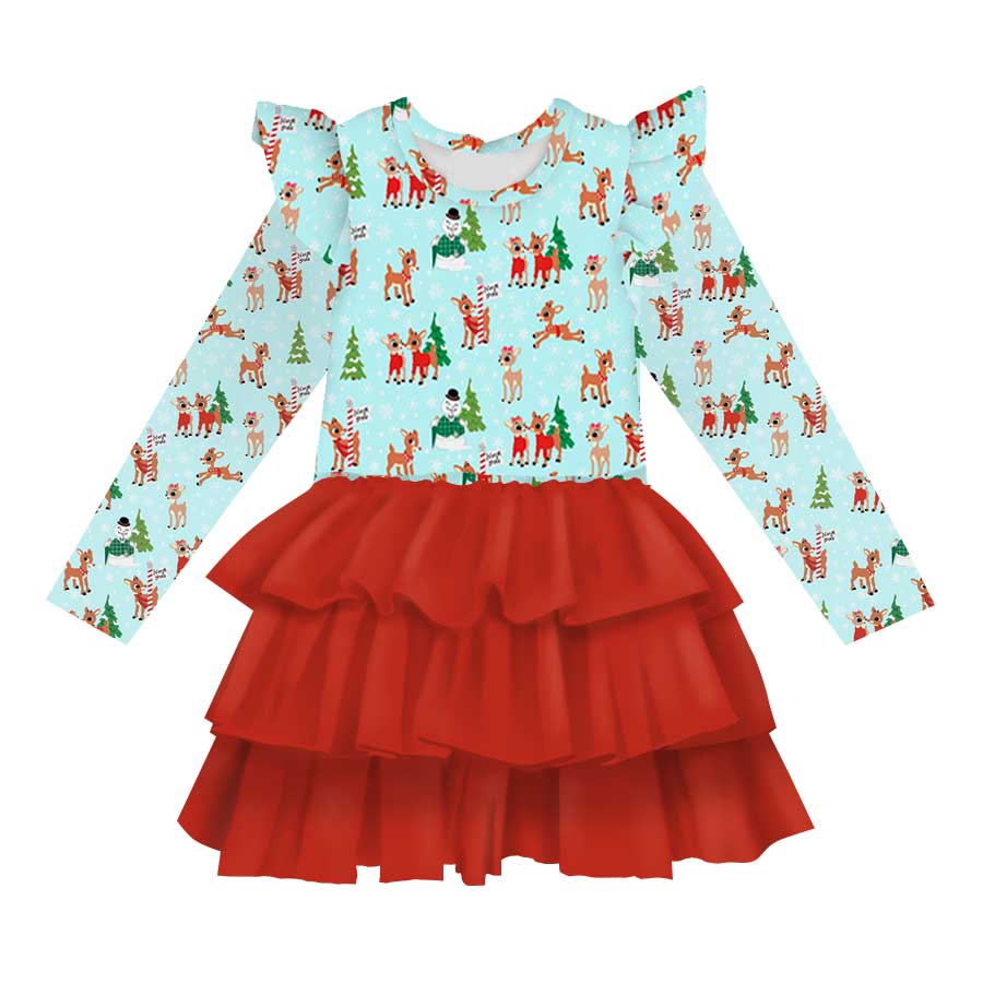 Happy Holidays Reindeer Kisses - Girl's Long Sleeve Bamboo Tiered Tulle Dress