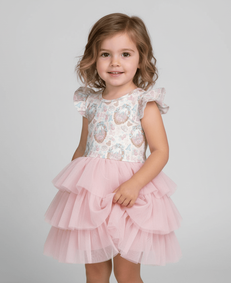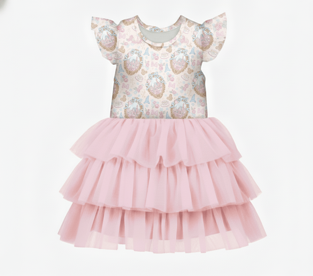 [Pre Order] Dream Big Teacups & Tiaras - Girls Flutter Sleeve Bamboo Tiered Tulle Dress (EST SHIP LATE MARCH)