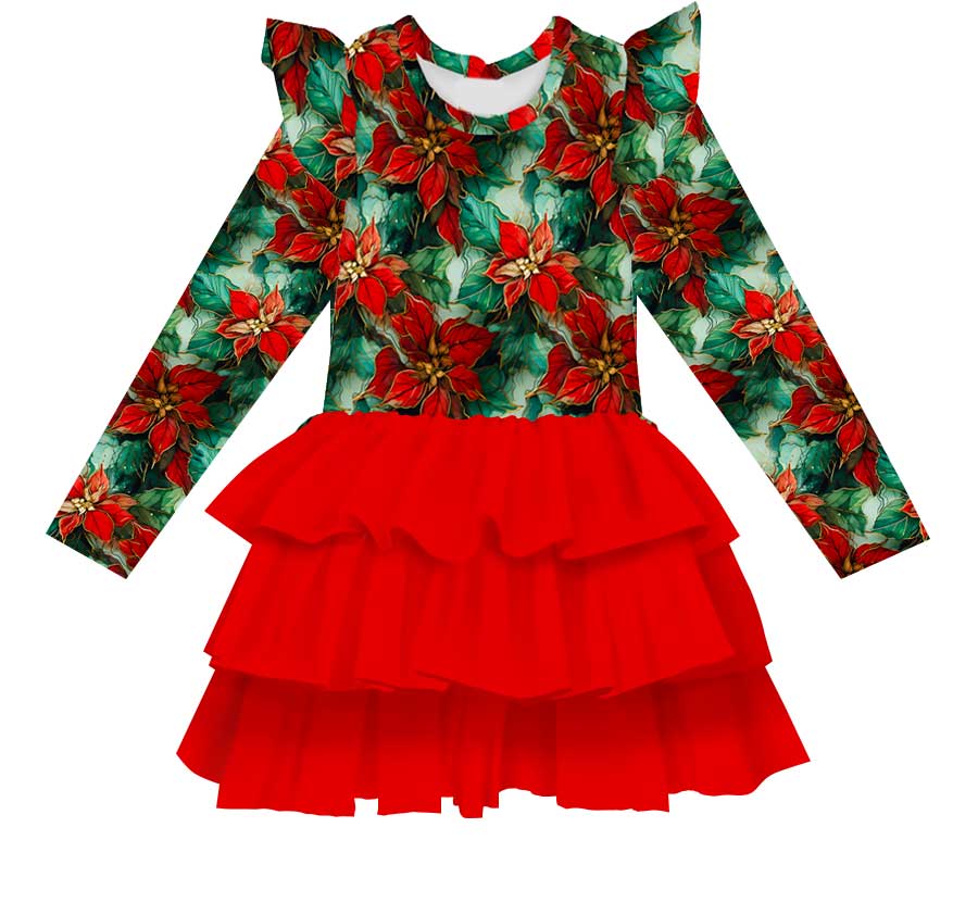 Feelin Festive Golden Poinsettia - Girls Long Sleeve Bamboo Tiered Tulle Dress