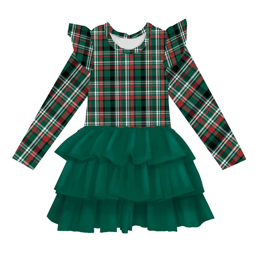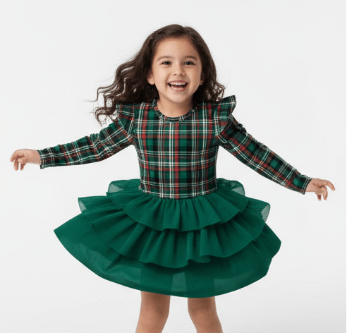 Happy Holidays Merry Tartan - Girls Long Sleeve Bamboo Tiered Tulle Dress ** Allow 7 Business Days For Orders To Ship**